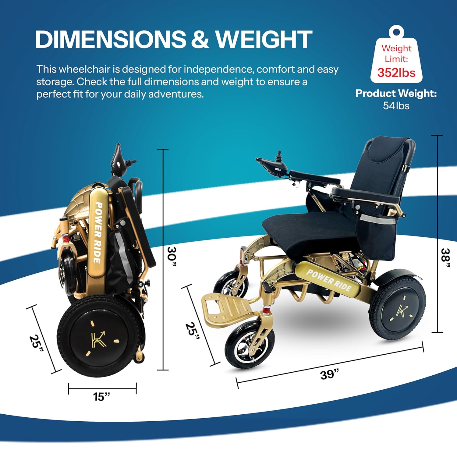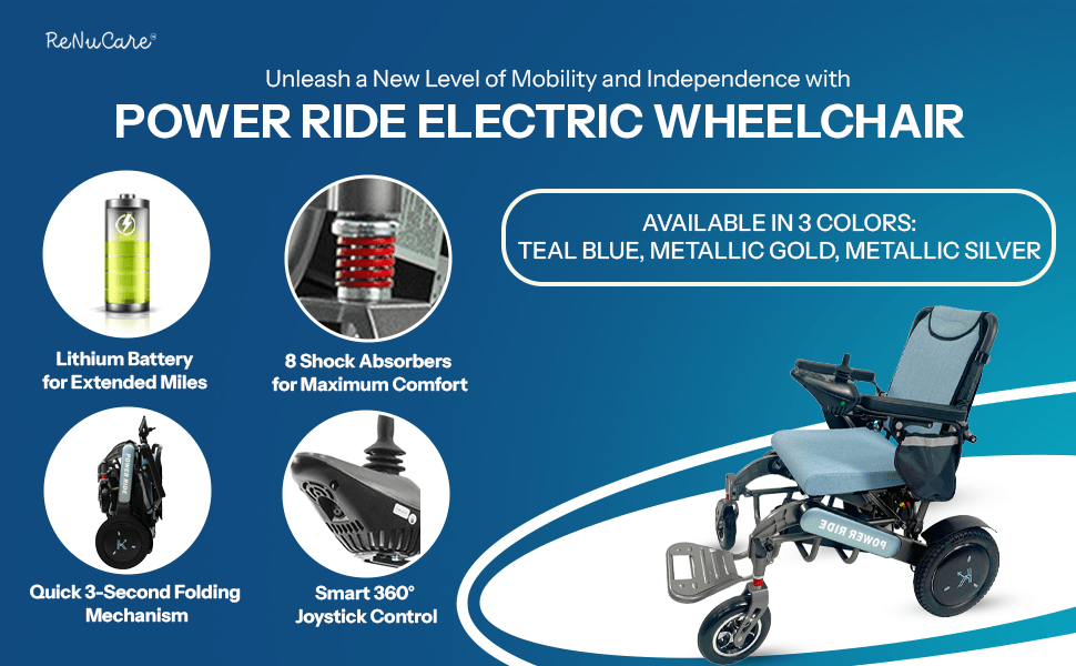 Introducing the ReNuCare Metallic Gold Power Ride, a beautifully engineered foldable electric wheelchair designed for users who want reliable performance, elevated comfort, and a touch of luxury. Built with a lightweight frame and intuitive controls, this advanced mobility chair brings freedom and independence everywhere you go. This electric reclined wheelchair delivers more mobility and comfort through a number of advanced features, including: